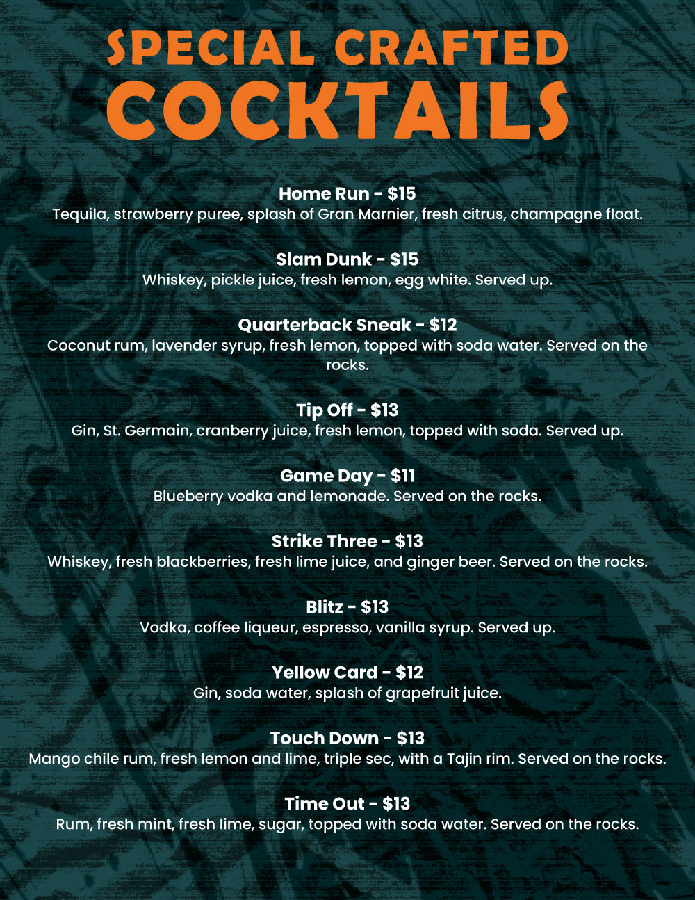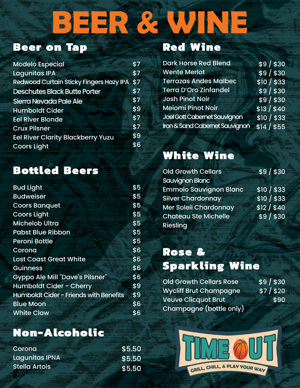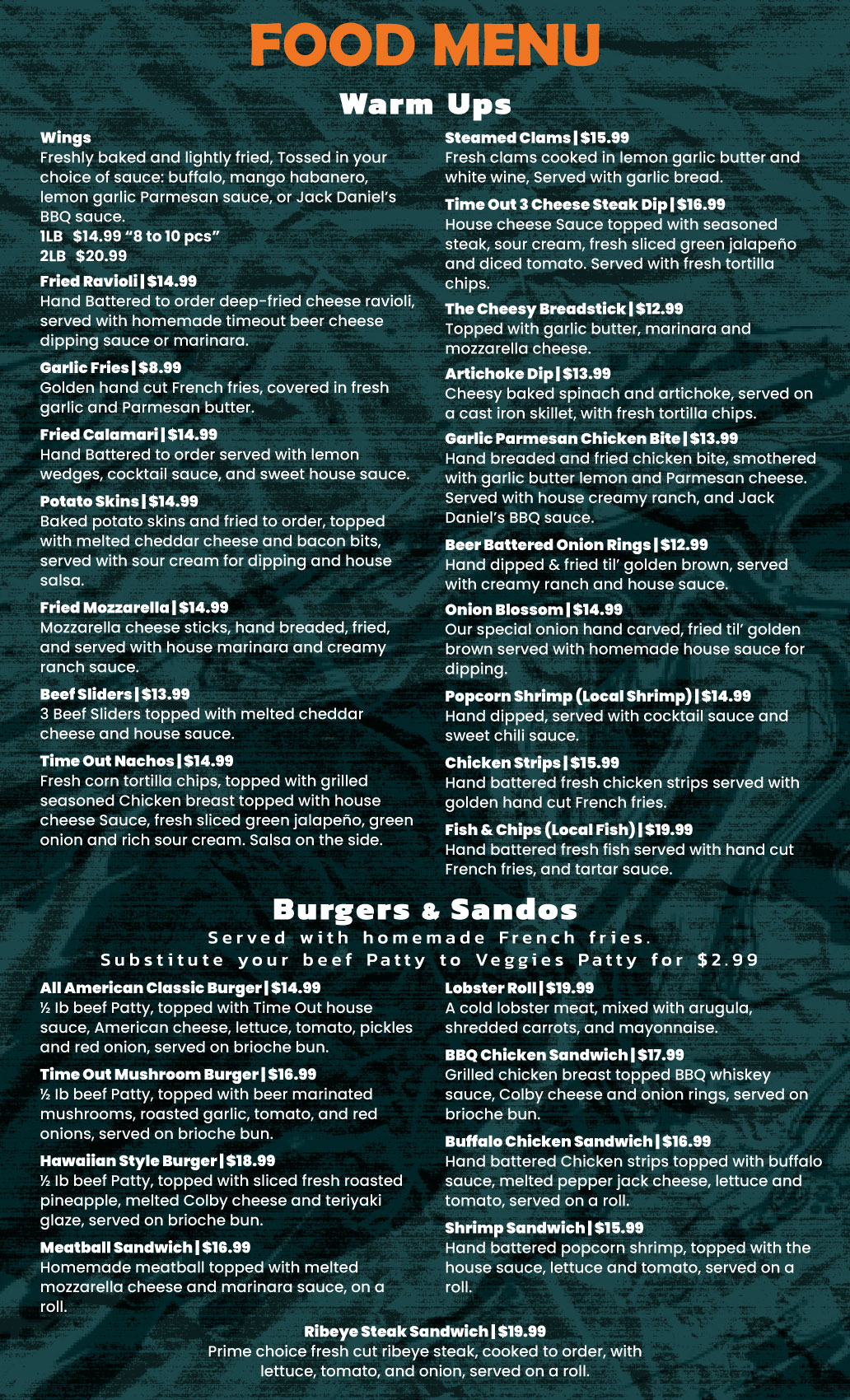 At Time Out Sports Bar and Restaurant, we serve up hearty favorites, shareable bites, and refreshing drinks in a lively, welcoming atmosphere. Whether you’re here for the big game or a casual night out, our menu has something to satisfy every appetite.